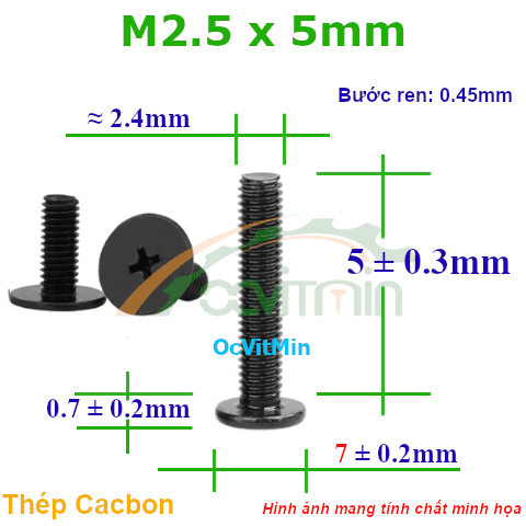 OcVitMin.Vn - Ốc Bake Đầu Dẹp Mỏng M2.5x5mm - ø7mm Thép Cacbon