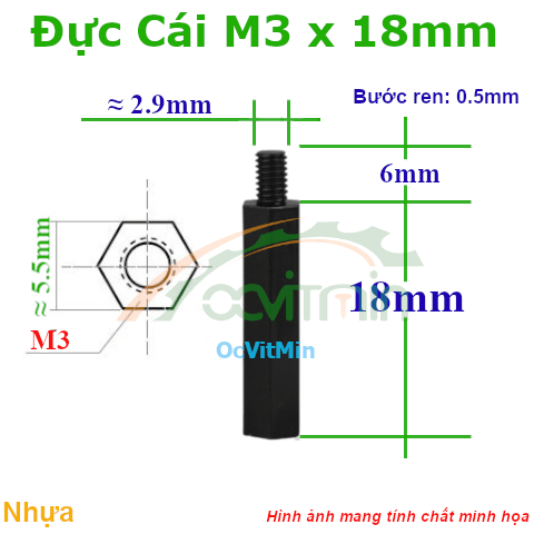 OcVitMin.Vn - Trụ Nhựa Đực Cái Lục Giác M3x18mm